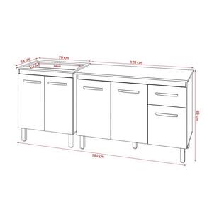 Altura com os pés: 83,5 cm Altura sem os pés: 67 cm Largura: 118 cm Profundidade: 50 cm Material: MDP (madeira) Portas: 3 portas Gavetas: 1 gaveta Prateleiras: 1 prateleira Puxadores: 4 puxadores plásticos cromados Pés: 5 pés reguláveis de plástico Altura dos pés: 16,5 cm Regulagem dos pés: Somente para nivelamento, até 18 cm Corrediças: Metálicas Indicações de Uso: Cozinha