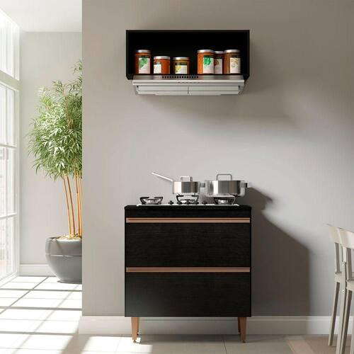 Caracteristicas do Balcao Cooktop Cozinha Sabrina 2 Gavetas 80cm: Produzida em MDP de 15 mm Acabamento UV na cor Preto Texturizado Gavetas com Corredica Telescopica Puxador Perfil em ABS na cor Bronze Pes Regulares em ABS na cor Bronze Tampo suporta 10 Kg e Gavetas suportam 3 Kg