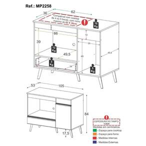 Possui tampo de 15mm recortável para Cooktop de 4 ou 5 bocas e espaço exclusivo para acomodar o seu forno (não compatível com forno embutido), otimizando o espaço da cozinha. O recorte do tampo deve ser feito no momento da montagem, conforme o tamanho do seu Cooktop (tamanho máximo do nicho: 62 x 36cm).