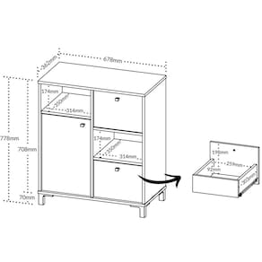 - 2 Gavetas com corrediças metálicas, fundo encaixado em MDF 3mm e frente em MDP 15mm com fita de borda ABS com 0,45mm de espessura;