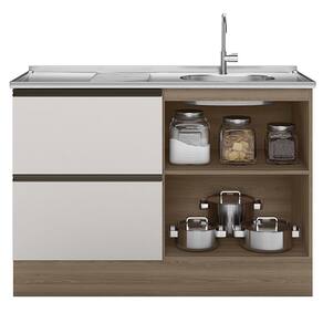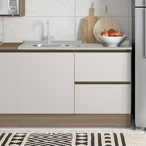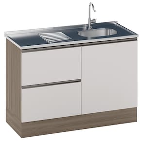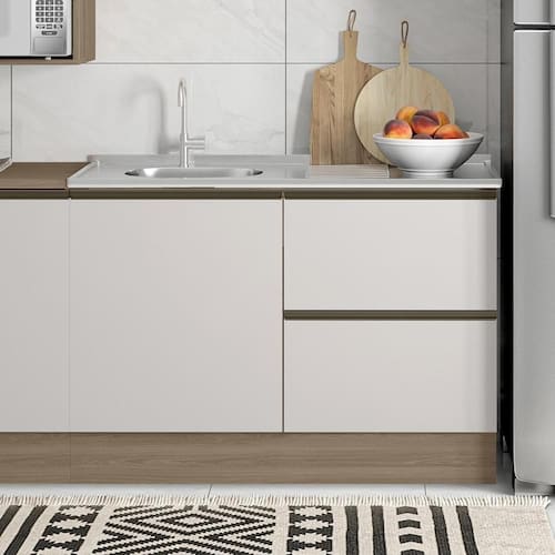 Balcão para Pia, projetado para oferecer funcionalidade e elegância ao seu ambiente culinário. Este balcão ível, sem tampo, é ideal para pias com cubas deslocadas à direita ou à esquerda, atendendo às dimensões de 120 cm x 50 cm. Fabricado em MDP de 15 mm com pintura UV nas portas, garantindo durabilidade e resistência. Conta com uma porta equipada com dobradiças metálicas de 35 mm e função slow motion, proporcionando um fechamento suave e silencioso. Possui duas gavetas, sendo uma com porta-talheres incluso. Todas são equipadas com corrediças telescópicas, permitindo abertura total e acesso facilitado aos utensílios. Inclui uma prateleira fixa interna, otimizando o espaço para organização de utensílios e mantimentos. Dispõe de pés em PVC com 14,5 cm de altura, reguláveis para um nivelamento perfeito ao piso. Os rodapés são fixados com presilhas modelo click espessura de 15 mm, facilitando a remoção e a limpeza do ambiente. Os puxadores modelo perfil em polímero com acabamento de alta cobertura agregam sofisticação ao móvel. Este balcão é uma excelente opção para quem busca aliar praticidade e estilo na cozinha, atendendo às necessidades de organização e estética do espaço. Este móvel chegará em sua casa separado em 01 volume.