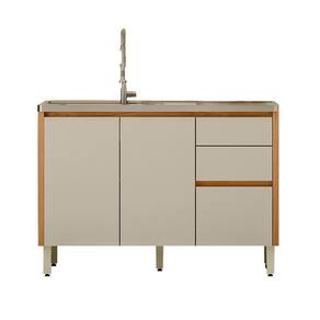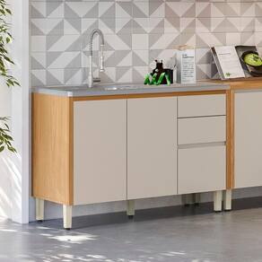 Possui 3 gavetas amplas com corrediças telescópicas, sendo uma delas com divisor de talheres, e 2 portas com prateleira interna, oferecendo amplo espaço para organização de utensílios, panelas e mantimentos. As dobradiças com amortecimento proporcionam fechamento suave e silencioso, enquanto as portas chanfradas com bordas soft destacam o visual sofisticado do produto.