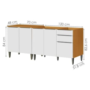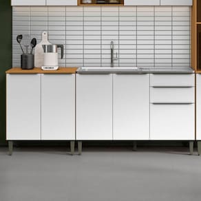 Balcão para Pia e Balcão com Tampo, design pratico e resistente para transformar sua cozinha. Estrutura em MDF (15/12 mm) e acabamento em Verniz. Possui portas com dobradiças metálicas, gavetas com corrediças telescópicas, puxadores e pés em plástico (pés 15 cm, regulagem de 3 cm) e prateleiras internas. Tampo não incluso (não acompanha pia). Estes produtos serão entregues em 2 volumes.