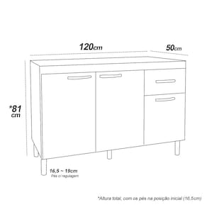 Com a regulagem dos pés, a altura total do balcão pode variar de 80,5cm à 83cm.
