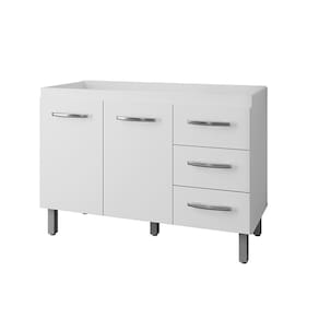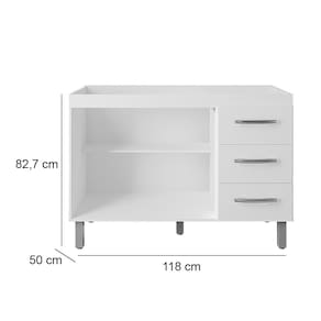 Características: Estrutura em MDP Acabamento em pintura UV 02 Portas com Dobradiças Metálicas 03 Gavetas com Corrediças Metálicas Puxadores em Plástico Cromados Altura dos Pés 16 cm Pés com Regulagem Prateleiras e Amplo Espaço Interno NÃO ACOMPANHA PIA E TAMPO