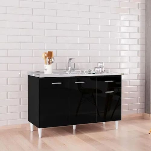 Balcão Poquema Para Cuba 3 Portas 1 Gaveta PretoBalcao 3 portas e 1 gaveta 1,20 m pode ser utlizado para cuba e com tampo(opcional), otimo para quem tem pouco espaco.MODELO: A434.11Fabricado em MDP 12 mmBalcao 03 Portas dobradicas metalicas, 01 Gaveta corredica metalicaPuxadores de Plastico Prata FoscoPes Plastico BrancoAcabamento em Pintura U.VDimensoes Do Produto:Altura: 81 cmLargura: 120 cmProfundidade: 52 cmPeso: 24 kgGarantia: 3 meses