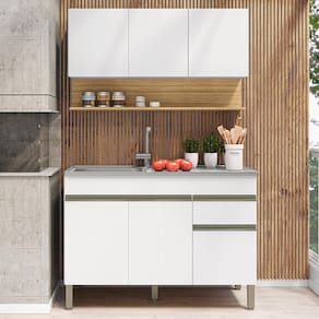 Balcão Para Pia e Armário Aéreo para quem busca praticidade na organização da cozinha. Produzido em MDP (15mm) com acabamento em pintura UV texturizada. Conta com 06 portas (portas superiores com sistema passante), 01 gaveta, 01 nicho inferior, dobradiças e corrediças metálicas e 01 prateleira interna. Os pés reguláveis são em plástico resistente e os puxadores em perfil alumínio (pintura epóxi). Não acompanha pia nem tampo. Este produto será entregue em 03 volumes.