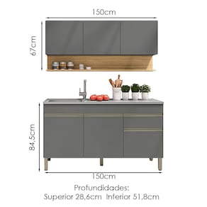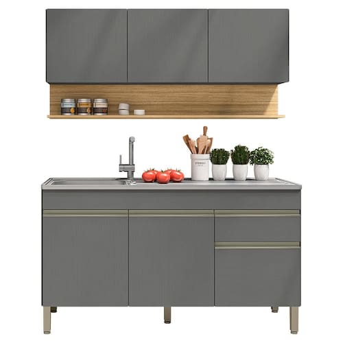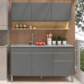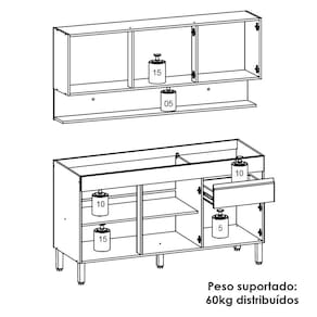 Balcão Para Pia e Armário Aéreo para quem busca praticidade na organização da cozinha. Produzido em MDP (15mm) com acabamento em pintura UV texturizada. Conta com 06 portas (portas superiores com sistema passante), 01 gaveta, 01 nicho decorativo, dobradiças e corrediças metálicas e 01 prateleira interna. Os pés reguláveis são em plástico resistente e os puxadores em perfil alumínio (pintura epóxi). Não acompanha pia/tampo. Este produto será entregue em 03 volumes.