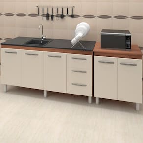 Balcão para Pia Emily e Multiuso Serena, é ideal para quem busca qualidade e sofisticação para compor sua cozinha da forma que desejar. Estrutura em MDP de 12 e 15mm, acabamento em pintura UV. Kit com 01 balcão para pia de 160cm de 3 portas e 3 gavetas e 01 balcão Multiuso, com 02 portas articuladas, dobradiças metálicas, puxadores em plástico cromado, espaço para utensílios, acompanham pés fixos que garantem a firmeza que o móvel precisa. Produzido com controle de qualidade e com excelente acabamento. Este móvel chegará em sua casa separado em 02 volumes.