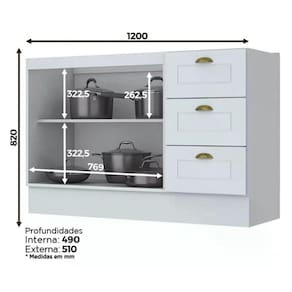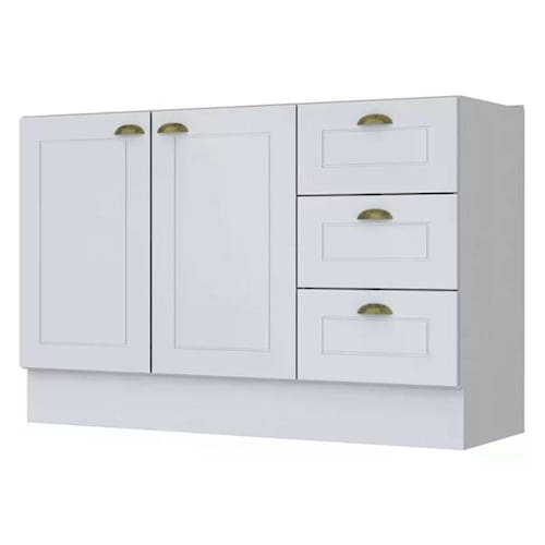 ESPECIFICAÇÕES: Estrutura 100% MDF Pintura UV fosca 2 Portas Dobradiças de 35mm com amortecimento 3 Gavetas Corrediças telescópicas Puxadores em zamac ouro velho Usinagem em baixo relevo *Não acompanha Cuba e Tampo Balcão Pia