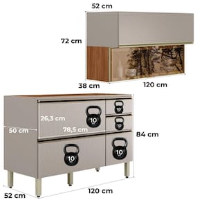 Sofisticado e funcional, o Conjunto Balcão e Armário Proença foi pensado para otimizar o espaço com elegância. Produzidos 100% em MDF (15 mm) com acabamento em pintura UV. Conta com portas basculantes com pistão a gás e dobradiças metálicas de 35 mm (sendo uma com vidro Reflecta de 3 mm), gavetas laterais (uma com divisor de talheres) e gavetão inferior, equipadas com corrediças telescópicas, pés com regulagem de altura e puxadores em alumínio. PIA/TAMPO, NÃO INCLUSO. Este produto será entregue em 03 volumes.