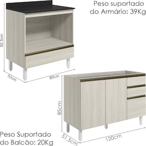 Peso Suportado do Balcão para Forno: 39Kg (20Kg tampo, nicho 15Kg e 04Kg gaveta)