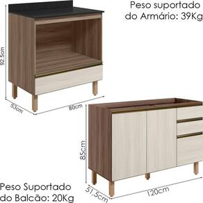 Peso Suportado do Balcão para Forno: 39Kg (20Kg tampo, nicho 15Kg e 04Kg gaveta)