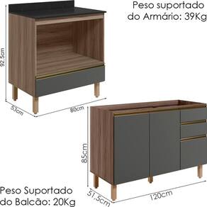 Peso Suportado do Balcão para Forno: 39Kg (20Kg tampo, nicho 15Kg e 04Kg gaveta)
