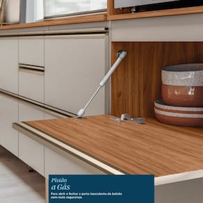 O Balcão Pia Proença 120cm une praticidade e design moderno. Fabricado em MDF com pintura UV, possui 1 porta basculante com dobradiças com amortecimento e pistão a gás, além de 4 gavetas com corrediças telescópicas para abertura suave. Inclui divisor de talheres, puxadores metálicos e pés com regulagem de altura, oferecendo amplo espaço interno para organização da cozinha.