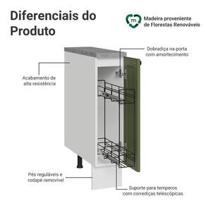 O acabamento da estrutura em Branco, combinado com a porta Verde, possuem textura suave ao toque. Os puxadores ponto em ouro envelhecido trazem personalidade, enquanto o chanfro das frentes cria molduras elegantes com inspiração no estilo americano com um toque moderno.