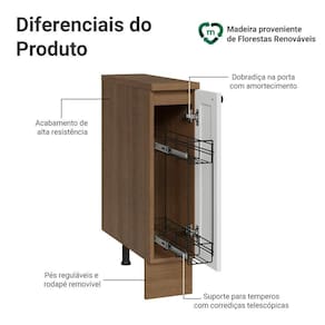 O organizador metálico interno possui deslizamento suave com abertura total, facilitando o uso no dia a dia. As dobradiças com amortecimento garantem fechamento silencioso, enquanto os pés reguláveis e o rodapé removível tornam a limpeza mais simples.