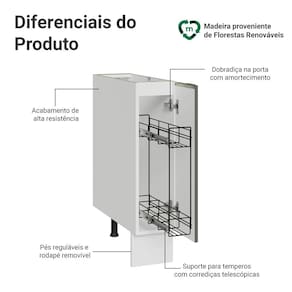 Equipado com um organizador metálico exclusivo, que desliza suavemente através de corrediças de abertura total, garantindo acesso fácil. A porta possui dobradiças com amortecimento, garantindo um fechamento suave e silencioso. Os pés são reguláveis e o rodapé é removível, facilitando a limpeza da parte inferior.