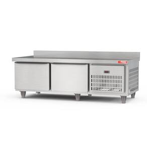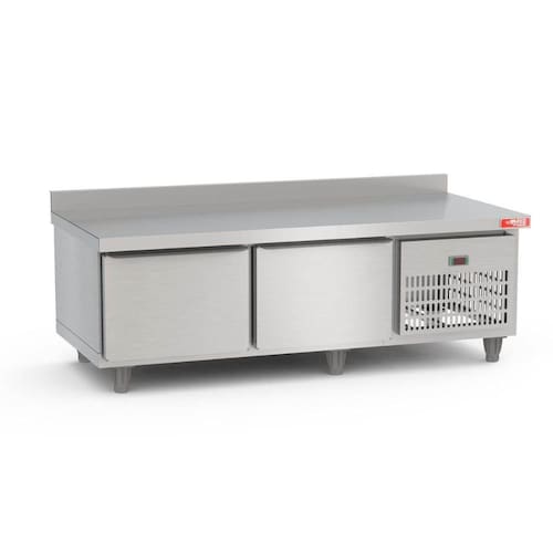 Balcão refrigerado com portas e isolamento térmico para suportar o uso como suporte de chapas, char broilers e fritadeiras. Ideal para lanchonetes, food trucks, hamburguerias e restaurantes.