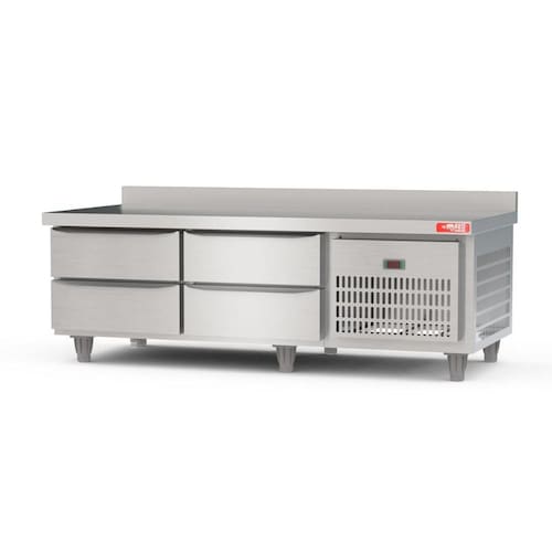 Balcão refrigerado com gavetas para suporte de chapas, char broilers, fritadeiras com isolamento do tampo em PU e em lã de rocha. Equipamento destinado para hamburguerias, restaurantes e lanchonetes.