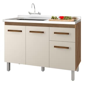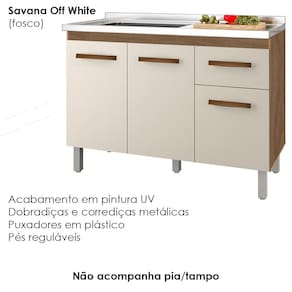 Balcão Sem Tampo Para Pia Anitta, uma excelente opção para sua casa. Estrutura em MDP de 12/15mm, com acabamento em pintura UV. Composto por 02 portas com dobradiças metálicas, uma prateleira interna para maior aproveitamento do espaço, 03 gavetas com corrediças metálicas, ideal para usar com pia de 120cm (pia não inclusa), puxadores em plástico cromado, pés fixos de 16,5cm que garantem a firmeza que o móvel precisa, possui perfeita combinação com os mais variados ambientes. Você pode compor sua cozinha da forma que desejar. Este móvel chegará em sua casa separado em 01 volume.