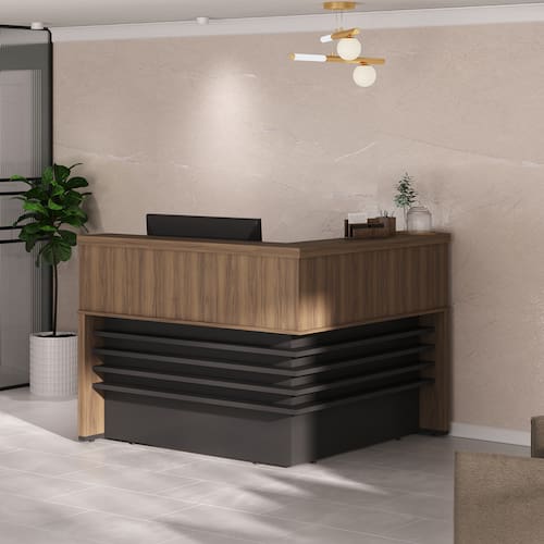 "Deseja um ambiente corporativo elegante para receber bem seus convidados e clientes? O Balcão Tamburato Atendimento II é perfeito para isso, pois é um produto sofisticado e ideal para atendimentos. Elegantes longarinas horizontais no produto proporcionam equilíbrio ao ambiente, e peças de Tamburato de 50mm de espessura certificam muita robustez e qualidade. Além disso, na parte interna há amplo espaço para trabalhar de forma organizada e eficiente.