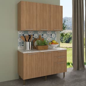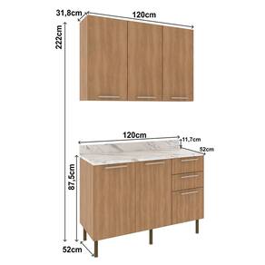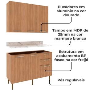 Transforme seu lar com o Conjunto de cozinha 03 peças. Composto por Armário Aéreo, Balcão para pia e um Tampo, com 120 cm cada. Produtos fabricado 100% MDP de 15mm com acabamento em pintura BP (fosco) e UV (brilho) e Tampo de 25mm com acabamento em pintura UV (semibrilho). Conta com 5 portas equipadas com dobradiças de 35 mm com amortecimento slow motion, além de 3 gavetas com corrediças telescópicas (sendo uma com divisor de talheres), puxadores em alumínio e pés reguláveis em PVC com altura de 17 cm e detalhe cromado. Este móvel chegará na sua casa separado em 05 volumes.