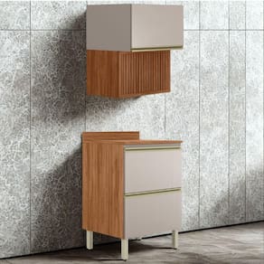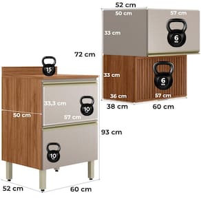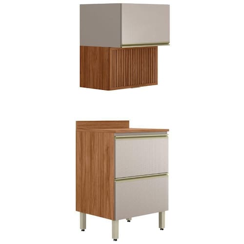 Conjunto Balcão e Armário Proença, ideal para otimizar o espaço da cozinha com praticidade. Produzidos 100% em MDF (15 mm) com acabamento em pintura UV. Conta com portas basculantes com pistão a gás e dobradiças metálicas de 35 mm (sendo uma com detalhe em ripado baixo relevo), gavetão inferior com corrediças telescópicas e puxadores em alumínio. Além de pés com regulagem de altura e tampo (20 mm) já inclusos no balcão. Este produto será entregue em 03 volumes.