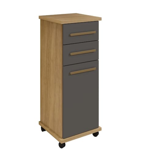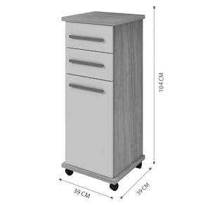 Para compor sua cozinha o Balcão Tókio vai te ajudar na organização de sua cozinha, unindo funcionalidade e praticidade. Ele possui um ótimo espaço interno e rodizio para facilitar sua locomoção.\nEspecificações do Produto Montado: Altura: 104 cm Largura: 39 cm Profundidade: 39 cm Peso: 20 Kg\nGarantia: 3 meses Material da estrutura: MDF 18mm Número de Portas: 01 Número de Gavetas: 02 Número de Prateleiras: 02 Rodizio incluso: Sim.\nObservações: Não oferecemos serviço de montagem, mas todos os produtos possuem manual de montagem com o passo a passo. Recomendamos contratar um profissional de montagem. Pode existir alguma diferença de tonalidade entre a foto e o produto, devido ao tratamento de imagens e à calibração de cores do monitor.
