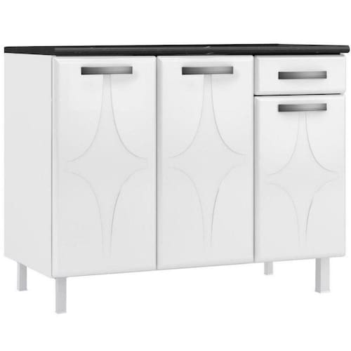Características: Peso suportado: 45kg Puxador: Plástico Número de portas: 3 Número de gavetas: 1 Tampo: Sim Material do tampo: mdp com revestimento laminado, cor preto e 15mm de espessura Quantidade de prateleiras: 1 Pés: 4 em Polipropileno com 13cm