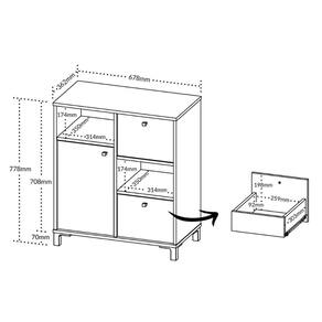 Ela possui um design escandinavo elegante. Possui uma porta e duas gavetas, com prateleira interna com regulagem de altura e gavetas que podem ser montadas em qualquer ordem.