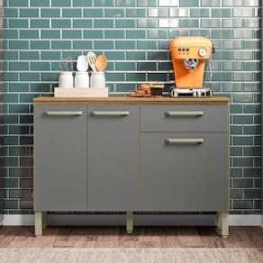 Com madeira reconstituída, que respeita o meio ambiente. Composto de três portas e uma gaveta, onde são utilizadas dobradiças e corrediças 100% metálicas, tampo que traz a praticidade de utilização de decorações, utensílios para cozinha e até mesmo eletrodomésticos. Os puxadores são ergonômicos em plástico resistente (poliestireno). Possui pés reguláveis em plástico resistente que garantem a estabilidade do produto. Acabamento com pintura UV.