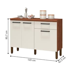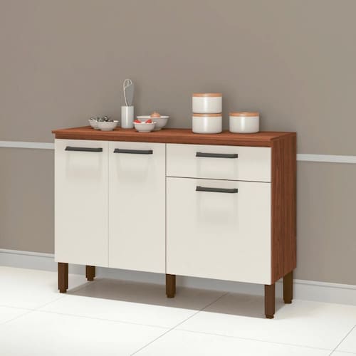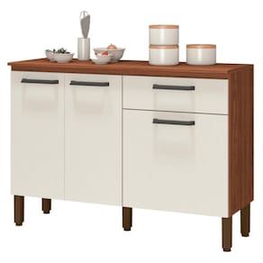 Com madeira reconstituída, que respeita o meio ambiente. Composto de três portas e uma gaveta, onde são utilizadas dobradiças e corrediças 100% metálicas, tampo que traz a praticidade de utilização de decorações, utensílios para cozinha e até mesmo eletrodomésticos. Os puxadores são ergonômicos em plástico resistente (poliestireno). Possui pés reguláveis em plástico resistente que garantem a estabilidade do produto. Acabamento com pintura UV.
