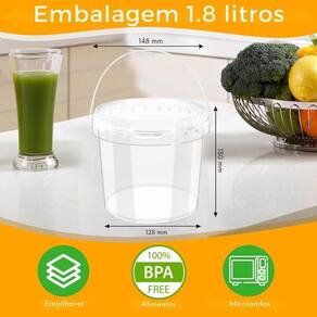 Balde transparente 1.8 litros com tampa lacre de segurança 100% bpa free - kit com 7 peças Importante: Os baldes sao comercializados vazios e sem impressão. O titulo do anuncio e o rotulo na foto são apenas sugestoes de uso Conteúdo do kit: 7 x baldes transparentes com alça plástica de 1.8 litros 7 x tampas plásticas transparentes com lacre de segurança Imagine abrir sua geladeira e encontrar todos os seus alimentos perfeitamente organizados e protegidos. Com nossos baldes transparentes, você visualiza o conteúdo sem precisar abrir as tampas, economizando tempo e evitando bagunça. A tampa com lacre de segurança garante que seus alimentos permaneçam frescos por mais tempo, evitando desperdícios e economizando dinheiro. Os baldes industriais da nastripack são fabricados com matéria-prima 100% virgem e atóxica, em conformidade com os requisitos da anvisa. Produzidos em equipamentos de última geração, esses baldes apresentam alta produtividade e baixo impacto ambiental. Ideal para: Uso comercial: restaurantes, padarias, lanchonetes, food trucks, cozinhas industriais. Uso doméstico: organizar e armazenar alimentos na geladeira, freezer ou despensa. Vantagens: Perfeito para congelamento: congele porções individuais de alimentos ou guarde sobras de forma segura e prática. Resistência térmica: suportam baixas e altas temperaturas, sendo aprovados para contato direto com alimentos. Versatilidade: ideal para armazenamento de tintas, químicos, produtos agrícolas, lubrificantes e alimentos. Tampa lacre: fechamento seguro e fácil de colocar, com design que permite empilhamento seguro. Reutilizáveis e sustentáveis: diminua o uso de embalagens descartáveis e contribua para um planeta mais limpo. Estes baldes são resistentes e podem ser reutilizados diversas vezes Fácil transporte: leves e com alça resistente, são práticos para transportar seus alimentos com segurança. Benefícios: Segurança alimentar: fabricados em polipropileno virgem, 100% livre de bpa e atóxico, garantindo que seus alimentos estejam protegidos e conservados de forma segura. Tampa com lacre de segurança: vedação hermética que impede a entrada de ar, umidade, poeira e insetos, mantendo seus alimentos frescos por mais tempo. Transparência: visualize o conteúdo sem precisar abrir o balde, facilitando a organização e identificação dos alimentos. Empilhável: otimize o espaço de armazenamento, seja na geladeira, freezer, despensa ou prateleiras. Resistente: suporta baixas e altas temperaturas, podendo ser levado ao freezer ou micro-ondas sem a tampa . Satisfação garantida: se por algum motivo você não estiver satisfeito com o produto, oferecemos de devolução do seu dinheiro. Compre agora e experimente a diferença Especificações técnicas: Balde: Diâmetro interno superior: 144,60 mm Diâmetro interno inferior: 125,00 mm Diâmetro externo superior: 152,90 mm Diâmetro externo inferior: 128,60 mm Diâmetro externo máximo: 164,50 mm Altura interna: 126,60 mm Altura externa: 129,50 mm Altura com a tampa: 130,50 mm Espessura média lateral: 0,75 mm Espessura média no fundo: 0,77 mm Peso: 50 gramas Material: polipropileno random Tampa: Diâmetro externo: 191,50 mm Altura: 12,10 mm Espessura média de parede: 0,80 mm Peso: 18 gramas Material: polipropileno random Descrição do produto: O balde transparente de 1.8 litros com tampa lacre é um recipiente versátil, projetado para o armazenamento seguro de alimentos. A transparência do balde facilita a visualização do conteúdo, tornando mais prático o uso no dia a dia. Principais características: Material seguro: fabricado em polipropileno pp de alta densidade, seguro para contato com alimentos. Design prático: a forma redonda permite empilhamento fácil, otimizando o espaço de armazenamento. Capacidade adequada: com 1.8 litros, é ideal para uso comercial em restaurantes, padarias, indústrias alimentícias, entre outros.