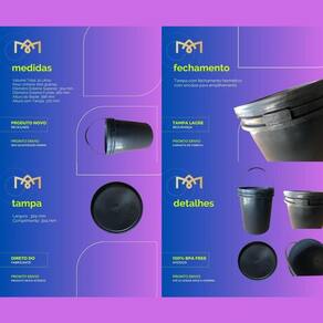 Baldes com tampa e alça plástica fabricados com material reciclado PP 05 PEAD 02 contaminante, não utilizar para envasar ou armazenar alimentos