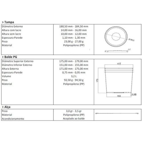 Balde 3,2l transparente com tampa preta e alça preta - kit 06 peças . Linha alimenticia: indicado para ou residencial Nesta compra você vai receber: 06 x baldes 3.2 litros transparente com alça preta 06 x tampas pretas com lacre de vedação Capacidade e medidas técnicas Volume real: 3,2 litros Diâmetro superior: 180,50 mm a 184,50 mm Diâmetro inferior: 151,00 mm a 155,00 mm Altura externa: 171,00 mm a 175,00 mm Espessura das paredes: 0,75 mm a 0,95 mm Peso do corpo: 92,50 g a 94,50 g Peso da alça: 3,0 g a 3,5 g Material: polipropileno pp atóxico e livre de bpa Esses dados técnicos asseguram que o balde para alimentos da nastripack atende aos mais rigorosos padrões de qualidade. O balde 3,2 litros transparente com tampa preta da nastripack é a solução ideal para empresas e consumidores que buscam um recipiente versátil, resistente e seguro para armazenar alimentos, ingredientes ou produtos diversos. Fabricado em polipropileno pp de alta qualidade, este balde para alimentos atende às mais exigentes normas de higiene e segurança alimentar. Com um design moderno, transparente e funcional, ele oferece praticidade no manuseio e confiança no armazenamento, destacando-se como um dos produtos mais completos do portfólio nastripack. Design transparente para visualização rápida: O corpo do balde 3,2 litros transparente com tampa preta foi desenvolvido para permitir a visualização total do conteúdo interno. Isso facilita o controle de , o acompanhamento de validade de produtos e a identificação imediata dos alimentos armazenados. Essa característica é essencial para cozinhas industriais, restaurantes, lanchonetes, confeitarias e empresas que precisam de organização e agilidade. Tampa preta com fechamento seguro: A tampa preta possui encaixe preciso e tecnologia de lacre, garantindo vedação hermética e proteção contra vazamentos ou contaminações. O balde com tampa preta da nastripack é ideal para armazenar líquidos, cremes, massas ou produtos sólidos, mantendo frescor, sabor e textura dos alimentos. Além disso, a tampa preta facilita a diferenciação de lotes ou categorias de produtos. Alça preta resistente e ergonômica: Para facilitar o transporte, o balde 3,2 litros transparente com tampa preta acompanha alça preta em polipropileno altamente resistente. A alça é confortável, ergonômica e oferece firmeza ao carregar produtos pesados. Isso transforma o balde com alça preta em um aliado no dia a dia de negócios alimentícios, laboratórios, cosméticos ou indústrias químicas que necessitam de recipientes práticos. Material de alta qualidade: polipropileno pp O balde 3,2 litros transparente com tampa preta é fabricado em polipropileno pp , um dos materiais plásticos mais seguros para contato com alimentos. É resistente a impactos, temperaturas variadas e à ação de substâncias químicas leves. Além disso, é 100% reciclável, reforçando o compromisso da nastripack com a sustentabilidade. Aplicações versáteis: O balde para alimentos de 3,2 litros pode ser utilizado em uma ampla variedade de aplicações: Armazenamento de produtos alimentícios molhos, cremes, grãos, farináceos, pastas, temperos ; Setor cosmético e farmacêutico cremes, pomadas, suplementos ; Indústrias químicas e de limpeza produtos concentrados, amostras, compostos líquidos ; Uso doméstico organização de despensa, freezer ou geladeira ; Transportes de pequenos volumes de líquidos ou sólidos com segurança. Essa versatilidade torna o balde 3,2 litros transparente com tampa preta um item indispensável para quem procura praticidade e qualidade. Vantagens do balde 3,2 litros transparente com tampa preta Transparência para identificar o conteúdo sem abrir; Tampa preta com fechamento seguro e lacre; Alça preta ergonômica para transporte confortável; Material atóxico e livre de bpa; Design resistente, leve e empilhável; Fabricado pela nastripack, referência em qualidade e inovação. Diferenciais da nastripack