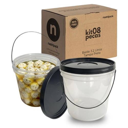 Balde 3,2l transparente com tampa preta e alça preta - kit 08 peças . Linha alimenticia: indicado para ou residencial Nesta compra você vai receber: 08 x baldes vazios 3.2 litros transparente com alça preta 08 x tampas pretas com lacre de vedação Capacidade e medidas técnicas Volume real: 3,2 litros Diâmetro superior: 180,50 mm a 184,50 mm Diâmetro inferior: 151,00 mm a 155,00 mm Altura externa: 171,00 mm a 175,00 mm Espessura das paredes: 0,75 mm a 0,95 mm Peso do corpo: 92,50 g a 94,50 g Peso da alça: 3,0 g a 3,5 g Material: polipropileno pp atóxico e livre de bpa Esses dados técnicos asseguram que o balde para alimentos da nastripack atende aos mais rigorosos padrões de qualidade. O balde 3,2 litros transparente com tampa preta da nastripack é a solução ideal para empresas e consumidores que buscam um recipiente versátil, resistente e seguro para armazenar alimentos, ingredientes ou produtos diversos. Fabricado em polipropileno pp de alta qualidade, este balde para alimentos atende às mais exigentes normas de higiene e segurança alimentar. Com um design moderno, transparente e funcional, ele oferece praticidade no manuseio e confiança no armazenamento, destacando-se como um dos produtos mais completos do portfólio nastripack. Design transparente para visualização rápida: O corpo do balde 3,2 litros transparente com tampa preta foi desenvolvido para permitir a visualização total do conteúdo interno. Isso facilita o controle de , o acompanhamento de validade de produtos e a identificação imediata dos alimentos armazenados. Essa característica é essencial para cozinhas industriais, restaurantes, lanchonetes, confeitarias e empresas que precisam de organização e agilidade. Tampa preta com fechamento seguro: A tampa preta possui encaixe preciso e tecnologia de lacre, garantindo vedação hermética e proteção contra vazamentos ou contaminações. O balde com tampa preta da nastripack é ideal para armazenar líquidos, cremes, massas ou produtos sólidos, mantendo frescor, sabor e textura dos alimentos. Além disso, a tampa preta facilita a diferenciação de lotes ou categorias de produtos. Alça preta resistente e ergonômica: Para facilitar o transporte, o balde 3,2 litros transparente com tampa preta acompanha alça preta em polipropileno altamente resistente. A alça é confortável, ergonômica e oferece firmeza ao carregar produtos pesados. Isso transforma o balde com alça preta em um aliado no dia a dia de negócios alimentícios, laboratórios, cosméticos ou indústrias químicas que necessitam de recipientes práticos. Material de alta qualidade: polipropileno pp O balde 3,2 litros transparente com tampa preta é fabricado em polipropileno pp , um dos materiais plásticos mais seguros para contato com alimentos. É resistente a impactos, temperaturas variadas e à ação de substâncias químicas leves. Além disso, é 100% reciclável, reforçando o compromisso da nastripack com a sustentabilidade. Aplicações versáteis: O balde para alimentos de 3,2 litros pode ser utilizado em uma ampla variedade de aplicações: Armazenamento de produtos alimentícios molhos, cremes, grãos, farináceos, pastas, temperos ; Setor cosmético e farmacêutico cremes, pomadas, suplementos ; Indústrias químicas e de limpeza produtos concentrados, amostras, compostos líquidos ; Uso doméstico organização de despensa, freezer ou geladeira ; Transportes de pequenos volumes de líquidos ou sólidos com segurança. Essa versatilidade torna o balde 3,2 litros transparente com tampa preta um item indispensável para quem procura praticidade e qualidade. Vantagens do balde 3,2 litros transparente com tampa preta Transparência para identificar o conteúdo sem abrir; Tampa preta com fechamento seguro e lacre; Alça preta ergonômica para transporte confortável; Material atóxico e livre de bpa; Design resistente, leve e empilhável; Fabricado pela nastripack, referência em qualidade e inovação. Diferenciais da nastripack.