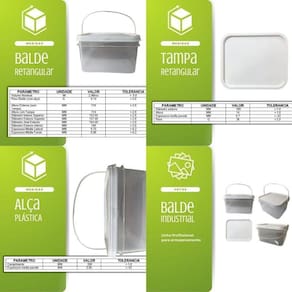 - embalagens com boa resistência em baixas e altas temperaturas e aprovadas para contato com alimentos. - balde plásticos rígidos desenvolvidos e fabricados especificamente para a indústria alimenticia, quimica e farmaceutica