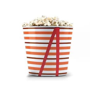 Balde de Pipoca com capacidade aproximada de 3,5 Litros, feito de plástico rigido injetado e personalizado 360 graus com adesivo especial e película protetica fosca.