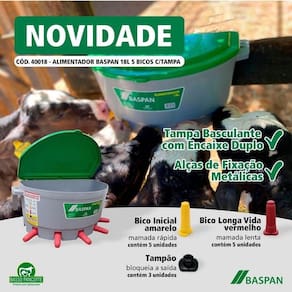 O Alimentador acompanha o Bico Inicial BASPAN Amarelo, que é macio e facilita o treinamento, permitindo maior fluxo de leite. O Bico Longa Vida BASPAN Vermelho, com o fluxo de leite controlado, robusto e forte. Proporciona a criação de 6 animais ou mais. Possui a chapa de reforço interna na base do bico, aumentando a resistência e durabilidade. Tem um sistema de encaixe rápido, facilitando a higienização.