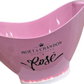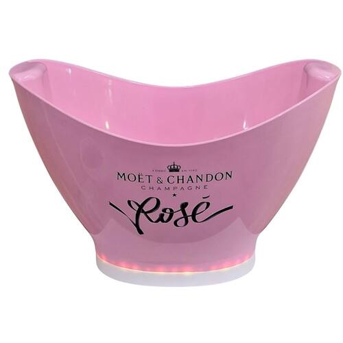 O Balde Moet Rosé Champagne Rosa LD Morose é um balde de gelo especialmente desenvolvido para acomodar e manter na temperatura ideal garrafas de Champagne, com destaque para vinhos espumantes da linha Moët & Chandon Rosé. O grande diferencial deste modelo é a base equipada com fita LED, proporcionando uma iluminação especial que valoriza o visual do balde e das garrafas, criando uma atmosfera sofisticada e exclusiva.