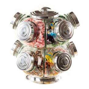 Ficha técnica: Baleiro de vidro giratório médio 10 potes Vidro transparente. Capacidade 700 gramas por gomo. Tampas metálica na cor alumínio polido. Base metálica na cor alumínio polido. Obs: a variação da capacidade de armazenar por gomo dependera do produto a ser armazenado.
