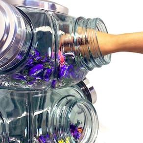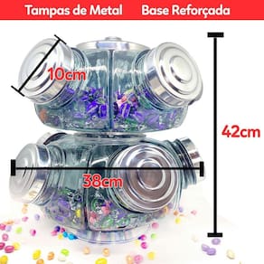 Baleiro Duplo Grande Giratório com Base Reforçada E Rolamento Porta Doce Baleiro Grande Duplo Giratório 5 Potes - Baleiro Artesanal IDEAL PARA COMÉRCIO / MERCEARIAS / VENDINHAS / LOJAS Baleiro artesanal com visual retrô atende a todos os tipos de consumidores ávidos por produtos diferenciados e ao mesmo imunes ao tempo.Podendo ser usado em estabelecimentos e em sua própria residência como item de decoração na sala, sala de estar, salão de festas,etc.. Com vidro transparente para ver todos os itens que colocar dentro: Balas, Doces e até cápsulas de café. Produto 100% artesanal e com acabamento diferenciado e resistente. Obs: As pequenas imperfeições, tais como irregularidades na espessura, no peso ou no diâmetro e as pequenas bolhas, que às vezes se formam dentro do vidro, são a clara garantia de um produto feito artesanalmente. Todos os produtos acompanham nota fiscal e estão a pronta-entrega. Pediu, chegou Ficha Técnica: - Baleiro de vidro Grande giratório 05 potes - Vidro transparente - Capacidade 700 ml por gomo/pote - Rolamento Axial- Tampa em Aluminio - Base super firme e segura com rolamento - Cor: Prata, Cobre ou Dourado/Gold Dimensões do Baleiro: - Altura 42 cm - Diametro total 38 cm- Diametro da boca 10 cm - Peso líquido 7kg Marca: Houme