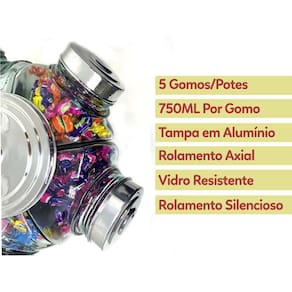 Super porta doce baleiro grande giratório 5 potes - baleiro artesanal + ( mini-baleiro fusquinha ) ideal para presentear/decorar Ideal para comércio - grande capacidade de 3.5 kg de balas e doces Baleiro artesanal com visual retrô atende a todos os tipos de consumidores ávidos por produtos diferenciados e ao mesmo imunes ao tempo.Podendo ser usado em estabelecimentos e em sua própria residência como item de decoração na sala, sala de estar, salão de festas,etc.. Com vidro transparente para ver todos os itens que colocar dentro: Balas, doces e até cápsulas de café. Produto 100% artesanal e com acabamento diferenciado e resistente. Obs: as pequenas imperfeições, tais como irregularidades na espessura, no peso ou no diâmetro e as pequenas bolhas, que às vezes se formam dentro do vidro, são a clara garantia de um produto feito artesanalmente. Ficha técnica: - baleiro de vidro grande giratório 05 potes - vidro transparente - capacidade 700 ml por gomo/pote- rolamento axial- tampa em aluminio - base super firme e segura com rolamento - cor: prata ( aluminio ) Dimensões do baleiro: - altura 25 cm- diametro total 40 cm- diametro da boca 9 cm Itens inclusos: Baleiro giratório grande de aluminio + mini baleiro fusquinha