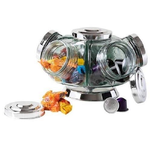 Ficha técnica: Baleiro de vidro giratório médio 05 potes Vidro transparente. Capacidade 300 gramas por gomo. Tampas plásticas na cor prata. Base plástica na cor prata. Obs: a variação da capacidade de armazenar por gomo dependera do produto a ser armazenado.