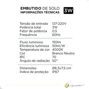 Os embutidos de solo são ideais para ambientes externos, possuem superfície de inox e sua aplicação é discreta e decorativa. Com o Índice de Proteção 67 IP67 , estão protegidos contra água, poeira e podem ser instaladas facilmente em pisos de áreas externas.Informações TécnicasTensão de entrada: 127-220VPotência total: 3WFator de potência: 0,5Frequência: 60HzFluxo luminoso: 150lmEficiência luminosa: 50lm/WTemperatura de cor: 4000KCor: Branco NeutroIRC: 70 Ngulo de radiação: 50Dimensões: 6,5x7,5 cmÍndice de proteção: IP67
