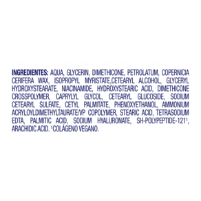 Aqua, glycerin, dimethicone, petrolatum, copernicia cerifera wax, isopropyl myristate, cetearyl alcohol, glyceryl hydroxystearate, niacinamide, hydroxystearic acid, dimethicone crosspolymer, caprylyl glycol, cetearyl glucoside, sodium cetearyl sulfate, cetyl palmitate, phenoxyethanol, ammonium acryloyldimethyltaurate/VP copolymer, stearic acid, tetrasodium EDTA, palmitic acid, sodium hyaluronate, sh-polypeptide-121, arachidic acid. Colágeno vegano.