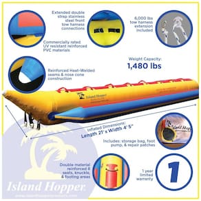 Barco de banana de nível projetado para acomodar 8 amigos em qualquer condição de água. Material Resistente a UV reforçado 1100 denier. Material denso resistente a perfurações, reforçado em áreas de alta tensão. Qualidade costuras soldadas e nariz vem para resistência e vida útil prolongada. Anéis de tração de aço inoxidável, arnês de reboque com alavanca de aço Dimensões infladas 6 metros Comprimento x 1,2 m. Carga máxima 8 pilotos 765 kg Marca: Não Informado