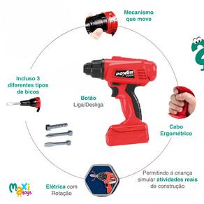 Equipado com 41 peças realistas, este carrinho oferece uma experiência única para os pequenos que adoram montar, consertar e explorar. Entre os destaques, está a Parafusadeira Elétrica com som e rotação de broca de verdade, que dá um toque ainda mais real à brincadeira. Serrote, chave de boca, chave ajustável, alicate, martelo, parafusos com porcas, broca, paquímetro, chave inglesa, painel de controle, adesivos.