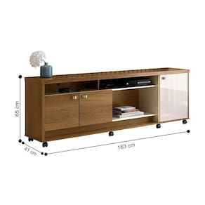 Feito em MDP. Possui 3 portas basculantes e 8 pés em rodizíos facilitando o manuseiro do produtoo. Tamanho de TV Suportado: Até 75